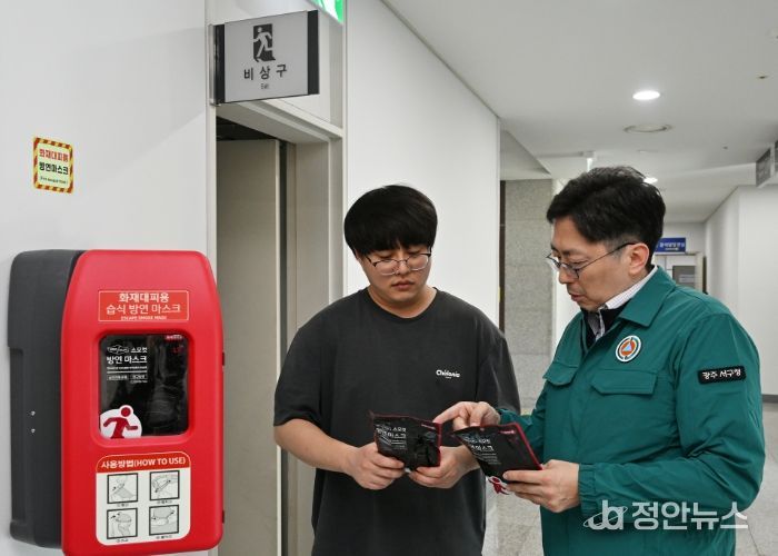 정안뉴스 박상욱 기자 | 광주광역시 서구는 화재 발생 시 연기 및 유독가스에 의한 질식사 등 인명피해를 최소화하기 위해 서구청사 내 다중이용 공간 및 비상구 주변에 화재대피용 방연마스크함을 설치했다.