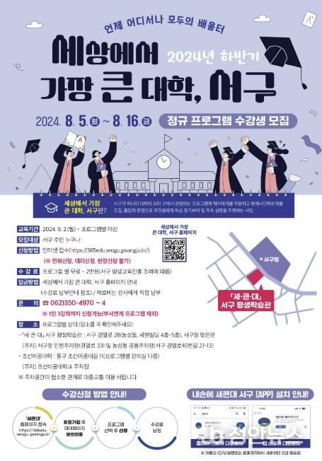 정안뉴스 박상욱 기자 | 광주광역시 서구가 오는 16일까지 ‘세상에서 가장 큰 대학, 서구’ 하반기 정규 프로그램 수강생을 모집한다.