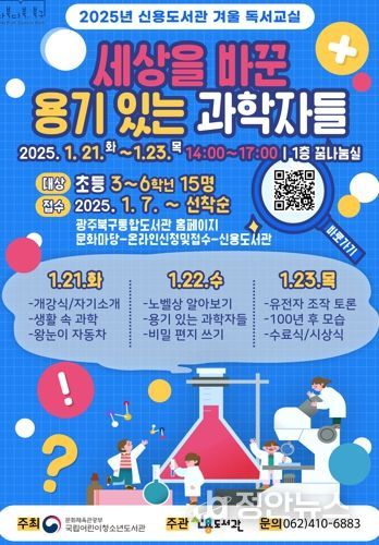 도서관별 독서교실 운영 기간은 ▲운암도서관 1월 14일~17일 ▲중흥도서관 1월 15일~17일 ▲일곡․양산․신용도서관 1월 21일~23일이며 참여를 희망하는 주민은 북구 통합도서관 누리집을 통해 선착순 신청하면 되고 기타 자세한 사항은 해당 도서관에 문의하면 된다.