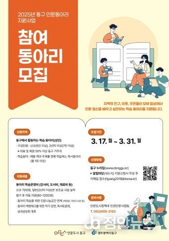 정안뉴스 기자 | 광주 동구는 책을 매개로 인문 정신을 배우며 사회적 독서공동체를 활성화하기 위한 ‘2025년 인문 동아리 지원사업’ 참여 동아리를 모집한다고 밝혔다.