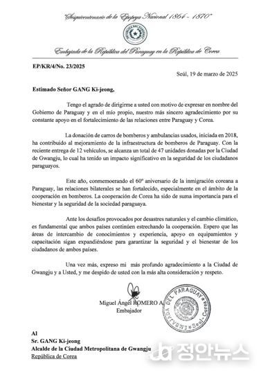 로메로 주한 파라과이 대사는 서한문에서 “파라과이 정부를 대표해 파라과이와 한국 간 우호적 관계 증진을 위해 지속적인 관심과 아낌없는 지원을 해주신 시장님께 깊은 감사의 인사를 드린다”며 “광주시의 협력은 파라과이 시민들의 안전을 지키는데 중요한 역할을 하며 양국 간 협력의 중요한 사례로 자리잡고 있다”고 밝혔다.
