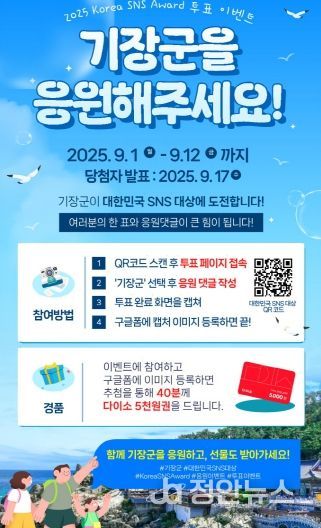 이벤트 참여 방법은 오는 9월 1일부터 12일까지 ‘대한민국 SNS 대상 투표 홈페이지에서 ‘기장군’을 선택하고 응원 댓글과 투표를 진행한 뒤, 투표 화면을 캡쳐하여 기장군 공식 SNS에 게시된 ‘구글폼’으로 제출하면 된다. 참여자 중 추첨을 통해 총 20명에게 상품권을 증정할 예정이다