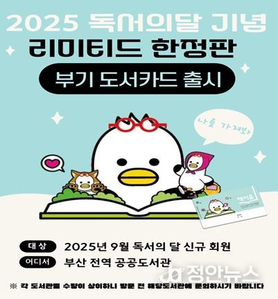 정안뉴스 황정혜 기자 | 부산도서관은 9월 독서의 달을 맞아 부산 16개 구·군 공공도서관에서 신규회원 대상 '부기 도서카드 발급 행사'를 개최한다고 밝혔다.