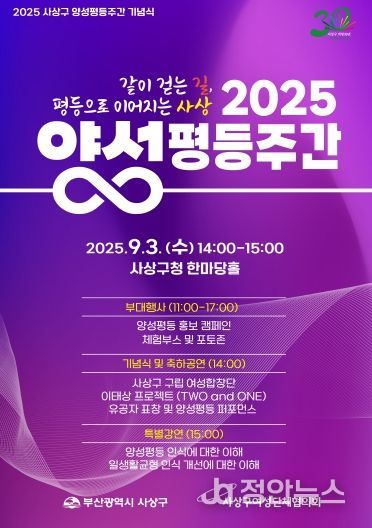 정안뉴스 황정혜 기자 | 부산 사상구은 올해 양성평등주간(1일부터 7일까지)을 맞아 ‘같이 걷는 길, 평등으로 이어지는 사상’이라는 주제로 기념식, 교육, 캠페인 등 다양한 행사가 펼쳐진다.