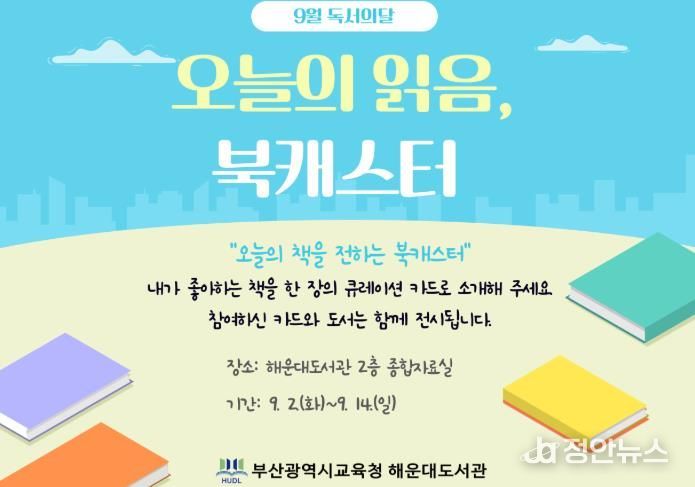 정안뉴스 황정혜 기자 | 부산광역시립해운대도서관은 오는 9월 2일부터 14일까지 해운대도서관에서 지역 주민을 대상으로 ‘오늘의 읽음, 북캐스터’행사를 운영한다.