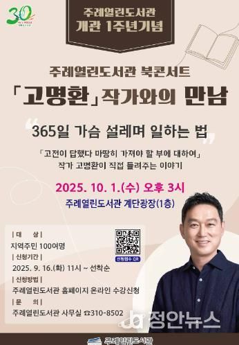 정안뉴스 황정혜 기자 | 사상구 주례열린도서관은 개관 1주년을 맞아 10월 1일 고명환 작가를 초청해 북콘서트‘365일 가슴 설레며 일하는 법’을 개최한다.