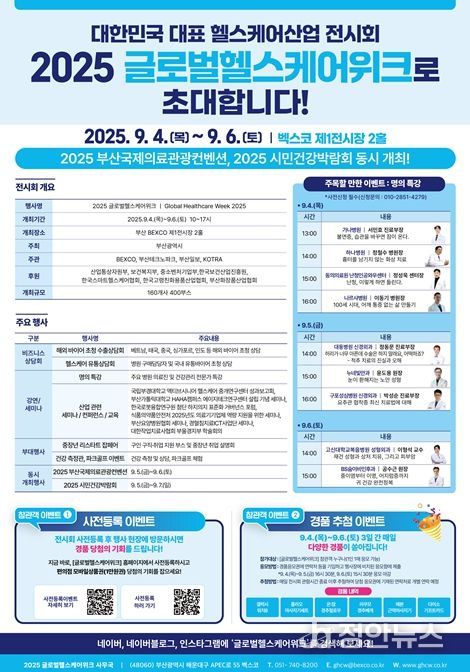 정안뉴스 황정혜 기자 | 부산시는 오는 4일부터 6일까지 벡스코 제1전시장에서 ▲복지 재활 ▲항노화 ▲화장품 산업의 발전과 ▲해외 시장 개척을 위한 '2025 글로벌 헬스케어 위크'를 개최한다고 밝혔다.
