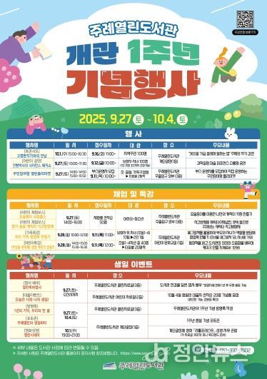 정안뉴스 황정혜 기자 | 부산 사상구 주례열린도서관은 개관 1주년을 맞아 지역주민들의 성원과 관심에 보답하고자 오는 9월 27일부터 10월 4일까지 다양한 기념행사를 진행한다.