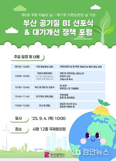 정안뉴스 황정혜 기자 | 부산시는 '제17회 자원순환의 날(9월 6일)'과 '제6회 푸른 하늘의 날(9월 7일)'을 기념해 오늘(4일) 공동 기념식을 개최한다고 밝혔다.