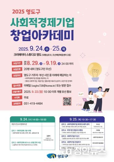 정안뉴스 황정혜 기자 | 부산시 영도구는 사회적경제의 이해와 창업 전문성 강화를 위한 ‘2025년 사회적경제기업 창업아카데미’ 수강생을 모집한다.