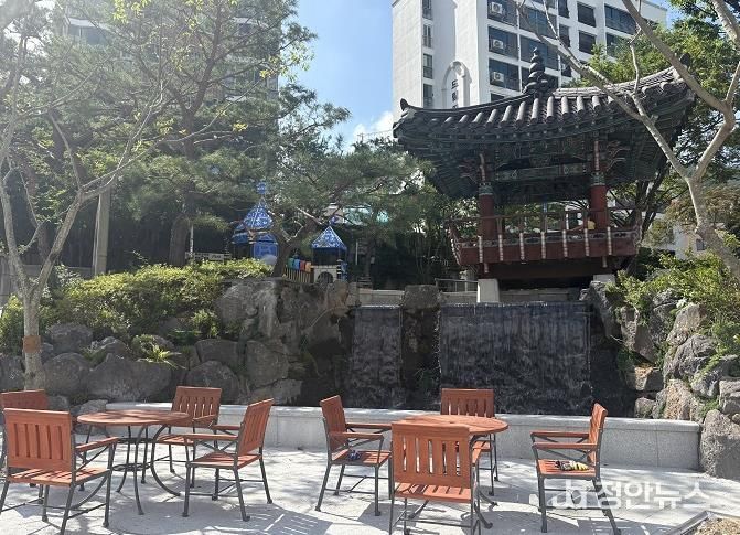 청룡노포동의 놀이마당공원은 기존 용머리 분수와 연계해 석가산 폭포를 새롭게 조성, 여름철 시원한 도심 속 쉼터로 탈바꿈했다.