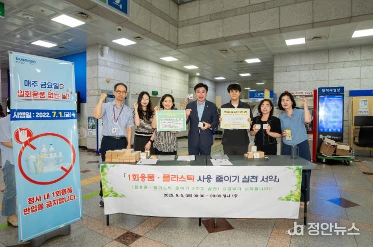 정안뉴스 황정혜 기자 | 부산 부산진구는 지난 5일 ‘1회용품·플라스틱 사용 줄이기 실천 서약’ 캠페인을 청사 내 1층 로비에서 진행했다.