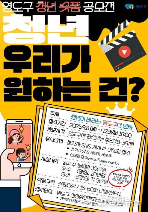 공모 주제는 △청년이 바라는 지역 정책·환경·문화 아이디어 △영도 청년들의 희망 이야기 △저출산·고령화 등 인구문제 인식 개선이며, 15~60초 이내의 숏폼 영상으로 제작하면 된다.