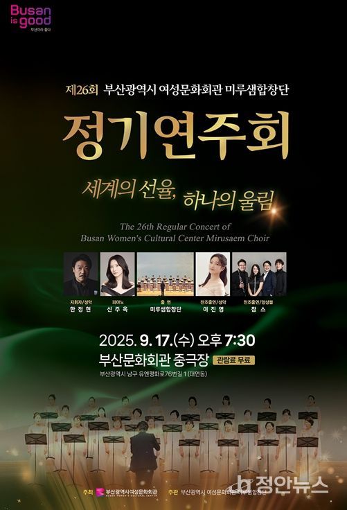 정안뉴스 황정혜 기자 | 부산시 여성문화회관은 오는 9월 17일 오후 7시 30분 부산문화회관 중극장에서 '제26회 미루샘합창단 정기연주회'를 개최한다고 밝혔다.