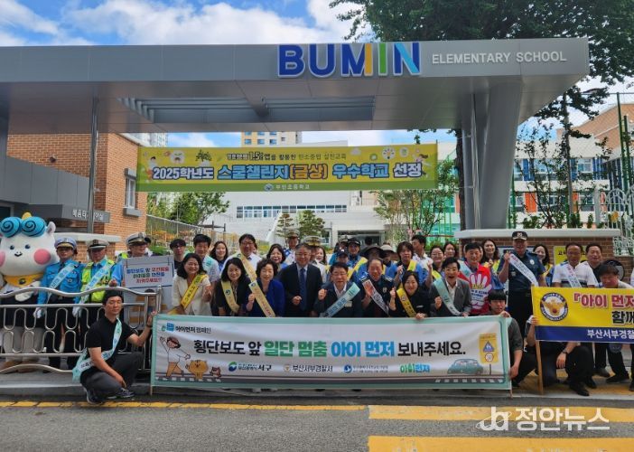 정안뉴스 황정혜 기자 | 부산광역시서부교육지원청은 4일 서구 부용동에 위치한 부민초등학교 주변 통학로에서 어린이 등굣길 교통사고 예방과 교통안전교육 일환으로 “아이 먼저 어린이 교통안전 합동 캠페인”을 실시했다.