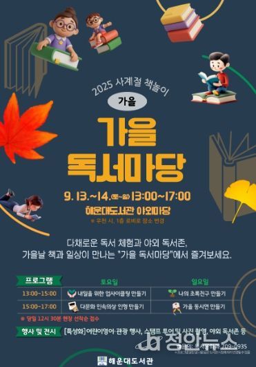 정안뉴스 황정혜 기자 | 부산광역시립해운대도서관은 오는 13~14일 오후 1시부터 5시까지 도서관 본관 야외마당에서 유아부터 성인까지 지역 주민을 대상으로 야외 독서 체험 한마당 ‘사계절 책놀이: 가을 독서마당’을 운영한다.
