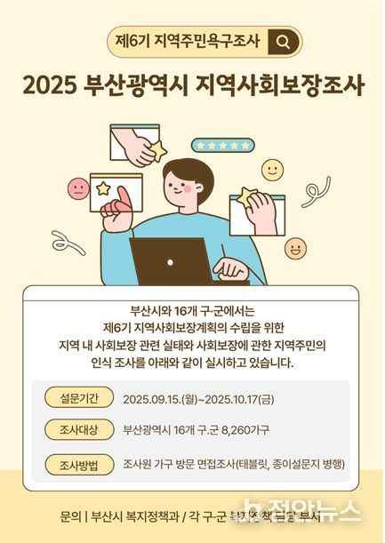 정안뉴스 황정혜 기자 | 부산시는 16개 구·군과 함께 오는 9월 15일부터 10월 17일까지 5주간 '2025년 부산광역시 지역사회보장조사'를 실시한다고 밝혔다.