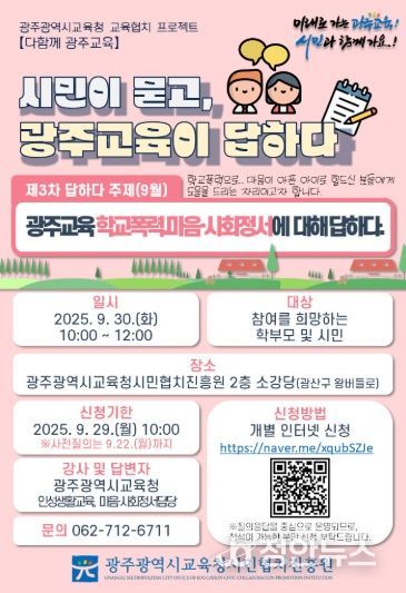 정안뉴스 안정주 기자 | 광주시교육청시민협치진흥원은 오는 30일 오전 10시부터 2시간 동안 본원 소강당에서 올해 세 번째 시민소통 행사 ‘시민이 묻고, 광주교육이 답하다’를 운영한다.
