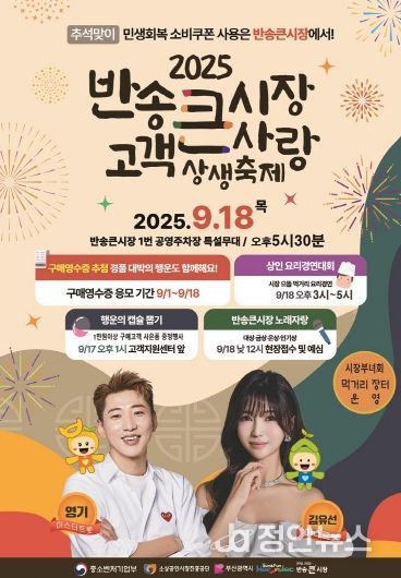 18일 오후 5시 30분에는 개막행사, 노래자랑대회, 초대 가수 공연, 구매영수증 경품추첨 등이 진행된다. ‘구매영수증 경품추첨’은 9월 1~18일 반송큰시장에서 1만 원 이상 구매하면 응모할 수 있다. 추첨을 통해 1등에게 30만 원 상당의 온누리상품권을 지급한다.
