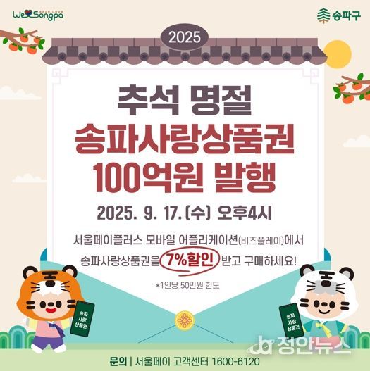 정안뉴스 안정주 기자 | 민족 대명절 추석을 앞두고, 서울 송파구가 총 100억 원 규모의 ‘송파사랑상품권’을 발행한다고 14일 밝혔다.