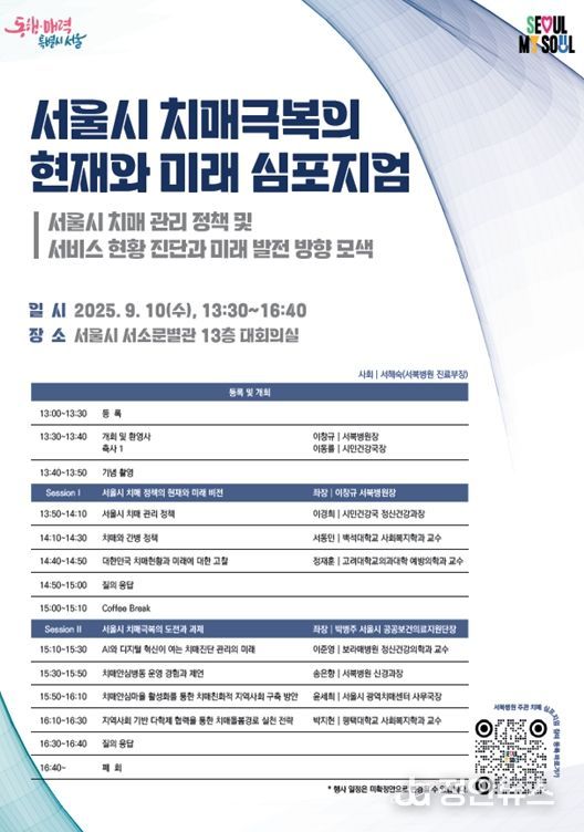 정안뉴스 안정주 기자 | 서울시 서북병원(병원장 이창규)은 9월 10일 서울시 서소문청사에서, 치매 정책에 적극 관여한 전문가를 모시고 서울시 유관기관 실무자 등 140여 명이 참석한 가운데 치매 심포지엄을 성황리에 개최했다고 밝혔다.