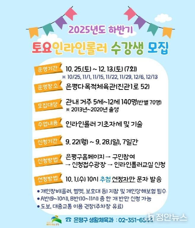 정안뉴스 안정주 기자 | 서울 은평구는 관내 어린이의 생활체육능력 향상을 위한 ‘하반기 토요 인라인롤러 교실’ 참여자를 오는 22일부터 28일까지 모집한다고 밝혔다.