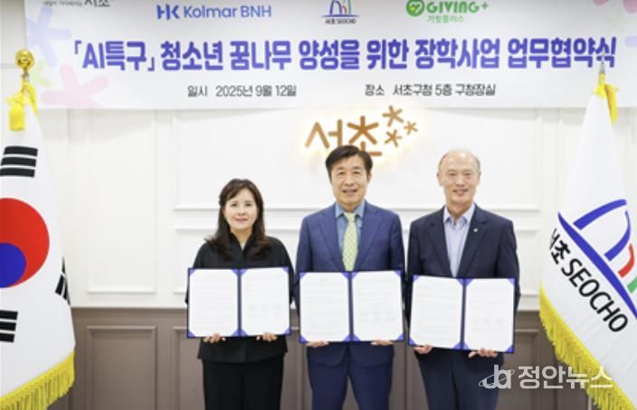 정안뉴스 안정주 기자 | 서울 서초구는 지난 12일, 국내 대표 건강기능식품 연구개발생산 기업 콜마비앤에이치, 재단법인 기빙플러스와 함께 ‘AI특구 청소년 꿈나무 양성을 위한 장학사업’ 업무협약을 체결했다고 밝혔다.