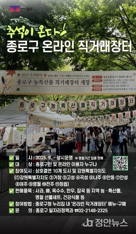 정안뉴스 안정주 기자 | 종로구는 민족 최대 명절 추석을 맞아 구민들의 명절 준비 부담을 덜고, 지역 소상공인들의 매출 증대를 지원하기 위해 ‘종로사랑상품권’을 발행하고 온라인 직거래 장터를 운영한다.