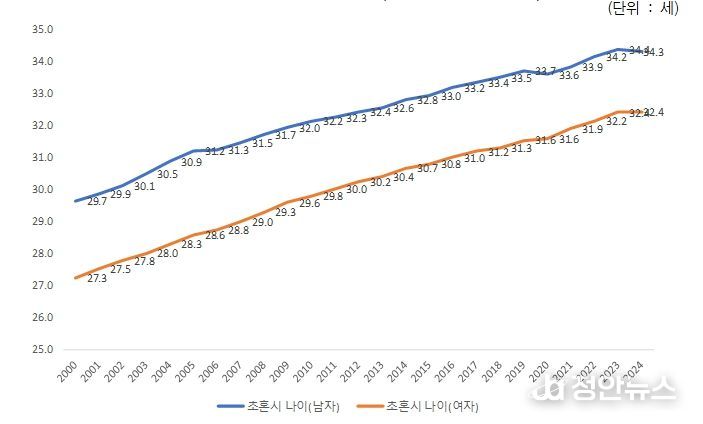 이혼은 전반적으로 감소세를 보였다. ‘이혼 건수’는 감소했지만 평균 이혼 연령은 높아져 2024년에는 남성 51.9세, 여성 49.4세로 '00년(남성 40.8세, 여성 37.4세)에 비해 10년 이상 상승했다. 60세 이상 ‘황혼이혼’은 2000년 이혼 건수 3%대에서 2024년 25% 수준까지 대폭 늘었다.