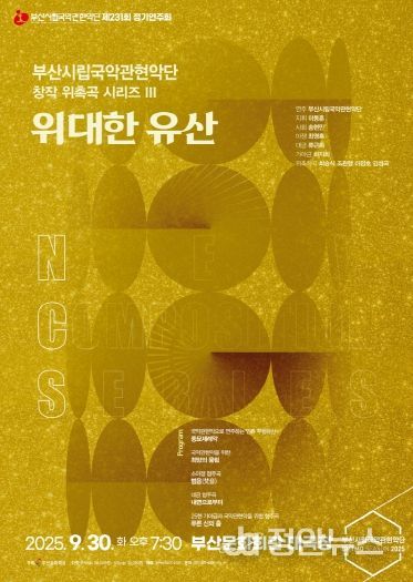 정안뉴스 황정혜 기자 | 부산시립국악관현악단이 오는 9월 30일 오후 7시 30분, 부산문화회관 대극장에서 제231회 정기연주회를 개최한다. 이번 무대는 창작위촉곡 시리즈 Ⅲ '위대한 유산'이라는 부제로, 우리 민족이 지켜온 정신적·예술적 전통을 현대적 언어로 재해석한 작품들을 선보인다.