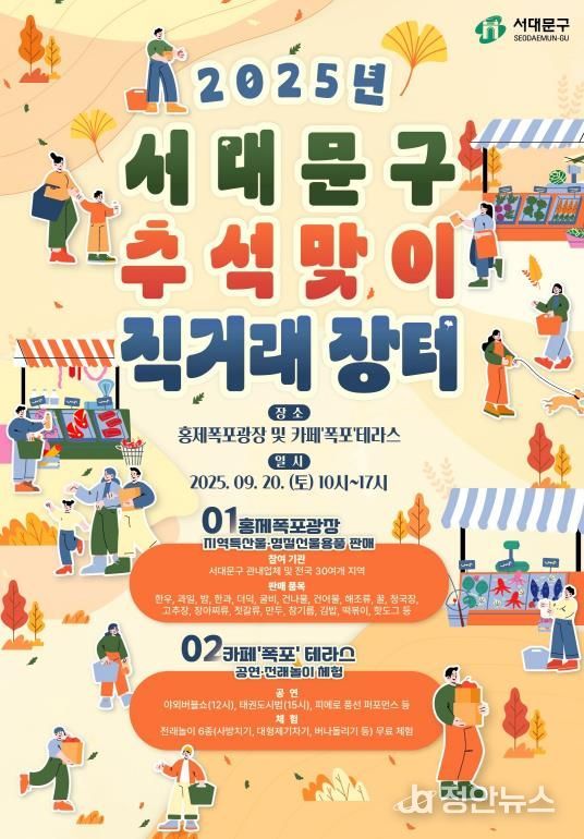 구는 이달 20일 토요일 오전 10시부터 오후 5시까지 홍제폭포광장과 카페 ‘폭포’ 테라스 일대에서 ‘추석맞이 직거래장터’를 개최한다.