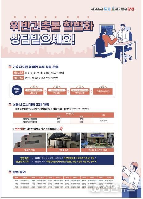 정안뉴스 안정주 기자 | 양천구는 서울시 도시계획조례 개정으로 제2·3종 일반주거지역 용적률이 한시적으로 완화됨에 따라, 건축사가 참여하는 전문 상담센터를 운영해 위반건축물 합법화 절차를 지원한다고 16일 밝혔다.