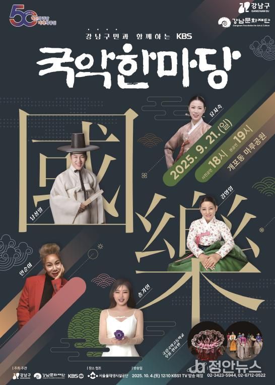 정안뉴스 안정주 기자 | 꿈이 모이는 도시, 미래를 그리는 강남구가 개청 50주년을 기념해 지역의 국악 문화를 널리 알리고자, 오는 9월 21일 오후 6시 개포동 마루공원에서 KBS 대표 국악 프로그램인 ‘국악한마당’을 개최한다.