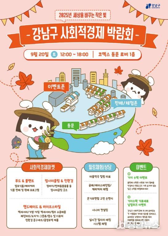 정안뉴스 안정주 기자 | 꿈이 모이는 도시, 미래를 그리는 강남구가 오는 9월 20일 낮 12시부터 오후 6시까지 코엑스 동문 로비 1층에서 ‘2025 강남구 사회적경제박람회’를 개최한다. 올해 행사는 기존 강남역 야외무대에서 벗어나 실내 공간에서 열리며, 사회적경제기업 30여 개소가 참여한다.