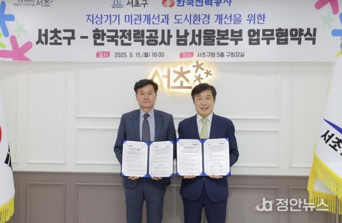 정안뉴스 안정주 기자 | 서울 서초구가 15일 서초구청에서 한국전력 남서울본부와 ‘지상기기 미관 개선과 도시환경 개선을 위한 업무협약’을 체결했다고 밝혔다. 이번 협약은 두 기관이 상호 협력하여 서초구 공공보도상 지상기기 정비를 통해 도시환경을 개선하고 쾌적한 보행환경을 만들기 위해 추진됐다.