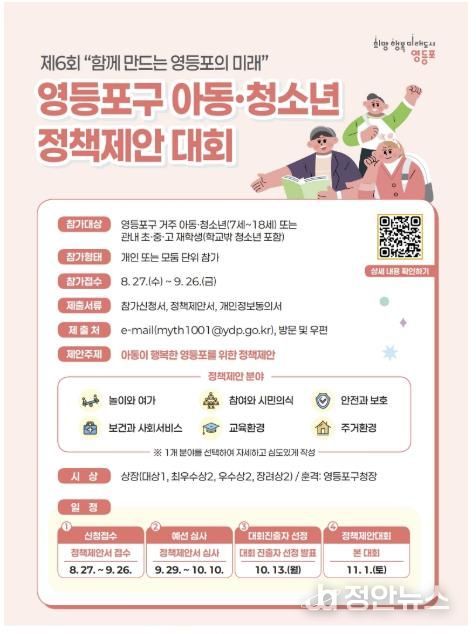 정안뉴스 안정주 기자 | 영등포구가 ‘제6회 아동ㆍ청소년 정책제안 대회’를 개최하고, 오는 9월 26일까지 참가 제안서를 접수한다고 밝혔다. 이번 대회는 아동ㆍ청소년들에게 정책에 참여할 기회를 제공하고 그들의 눈높이에 맞는 정책을 구정에 반영하기 위해 기획됐다.