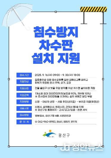 정안뉴스 안정주 기자 | 광주 광산구가 집중호우로 인한 침수 피해 예방을 위해 ‘침수방지 차수판 설치 지원사업’을 추진한다.