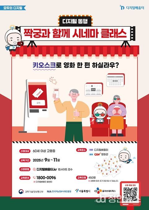 CJ올리브네트웍스와 함께하는 ‘짝궁과 함께 시네마 클래스’는 30회에 걸쳐 450명의 어르신이 참여한다. 참가자들은 디지털배움터에서 기본 이론을 배우고, CGV 매장에서 영화표를 직접 예매·관람하며 디지털을 생활과 문화로 연결한다. 실습에 참여한 교육생 전원에게는 1만 5천 원 상당의 영화관람권이 제공돼, 단순 교육을 넘어 실제 체험과 문화생활을 동시에 누릴 수 있다.