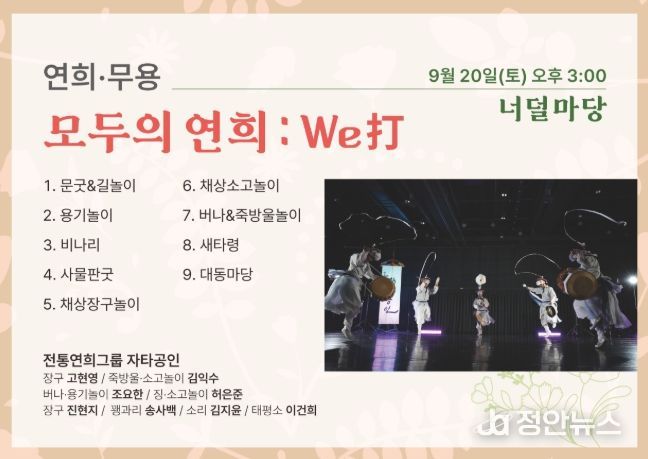 정안뉴스 안정주 기자 | 광주문화재단 전통문화관은 오는 9월 20일 오후 3시, 토요상설공연 19회차 무대에서 전통연희그룹 ‘자타공인’과 함께하는 특별공연 '모두의 연희 : We 打'를 선보인다.