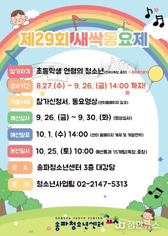 정안뉴스 안정주 기자 | 서울 송파구가 가을날 청소년들의 감수성을 채워줄 아동·청소년 음악축제를 10월 25일 송파청소년센터 대강당에서 개최하고, 참가팀을 모집한다고 알렸다.