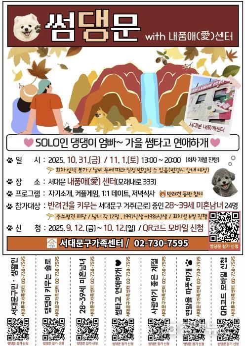 정안뉴스 안정주 기자 | 서대문구는 서대문구가족센터가 10월 31일과 11월 1일 서대문 내품애(愛)센터(모래내로 333)에서 반려견을 키우는 미혼남녀 만남 행사 ‘썸댕문 with 내품애센터’를 개최한다고 17일 밝혔다.