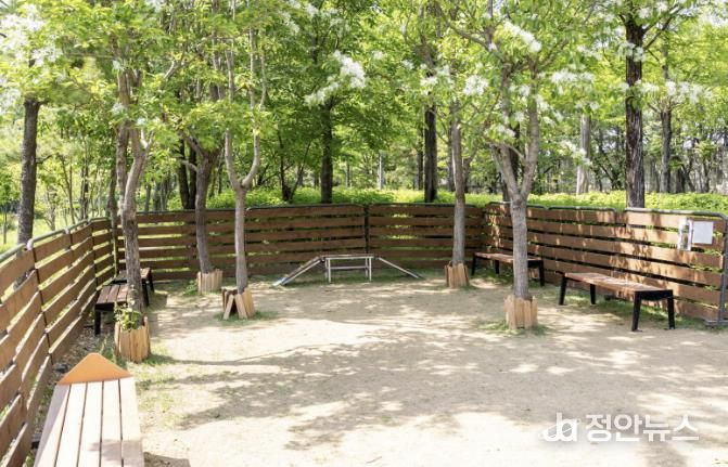 새로 조성된 ‘어울림공원 반려견 쉼터’는 약 132㎡ 규모로, 배변봉투함, 이동식 펜스, 보호자 휴게시설 등 편의시설을 갖췄다.