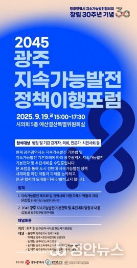 정안뉴스 안정주 기자 | 광주광역시와 광주연구원, 광주광역시지속가능발전협의회는 오는 19일 오후 3시 광주시의회 5층 예산결산특별위원회실에서 ‘2045 광주 지속가능발전 정책이행포럼’을 개최한다.