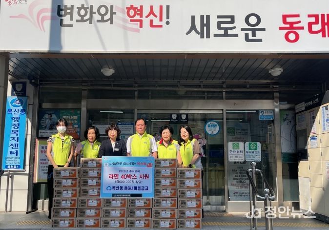 정안뉴스 황정혜 기자 | 부산 동래구 복산동 행정복지센터(동장 제은미)는 복산동새마을금고(이사장 김동길)로부터 추석 명절을 맞아 라면 40박스를 지원받았다고 밝혔다. 해당 성품은 홀로 어르신과 복지사각지대 가정 등 소외계층에 전달될 예정이다.