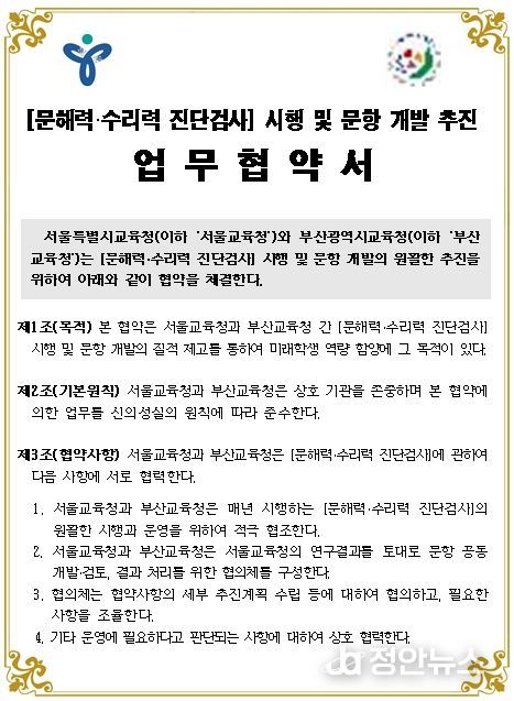정안뉴스 안정주 기자 | 서울특별시교육청과 부산광역시교육청은 2025년 9월 18일, 학생들의 핵심역량 강화를 위한 ‘문해력·수리력 진단검사 개발 및 운영’에 상호 협력하는 업무협약을 체결한다.
