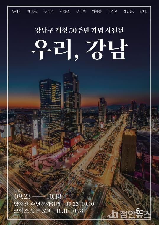 정안뉴스 안정주 기자 | 꿈이 모이는 도시, 미래를 그리는 강남구가 개청 50주년을 맞아 강남의 변화와 일상을 기록한 기념 사진전 ‘우리, 강남’을 연다. 전시는 9월 23일~10월 10일 양재천 수변문화쉼터, 이어 10월 11일~10월 18일 코엑스 동문 로비에서 야외 순회로 진행돼 더 많은 시민이 일상 동선에서 자연스럽게 관람할 수 있다.