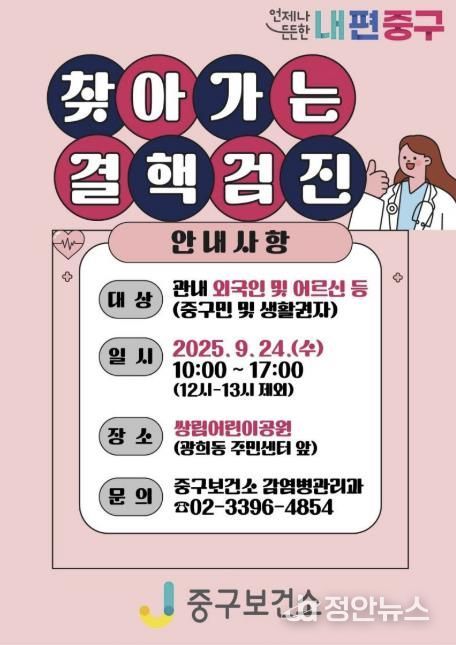 정안뉴스 안정주 기자 | 서울 중구가 결핵 조기 발견과 감염 확산 방지를 위해 오는 24일(수) 오전 10시부터 오후 5시까지 광희동 주민센터 앞 쌍림어린이공원에서 '찾아가는 결핵검진'을 무료로 실시한다.