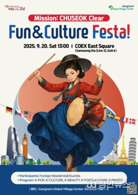 정안뉴스 안정주 기자 | 꿈이 모이는 도시, 미래를 그리는 서울시 강남구가 9월 20일 오후 1시부터 5시까지 코엑스 동측광장(영동대로 513)에서 외국인 주민과 관광객이 함께하는 다문화 축제 ‘펀앤컬처 페스타 Fun&Culture Festa! (미션 : 추석 클리어)’를 연다.