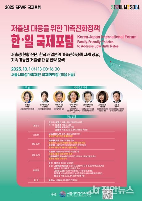 정안뉴스 안정주 기자 | 서울시여성가족재단은 오는 10월 1일 오후 1시부터 4시 30분까지 서울여성플라자 국제회의장에서 '저출생 대응을 위한 가족친화정책 한·일 국제포럼'을 개최한다고 밝혔다.