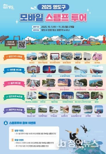 정안뉴스 황정혜 기자 | 부산 영도구는 오는 10월부터 11월까지 2개월간 ‘영도구 모바일 스탬프 투어’를 운영한다. 모바일 스탬프 투어는 영도 곳곳의 대표 관광지를 여행하며 스탬프 인증을 받는 여행 프로그램으로 ▲영도다리 너머로 ▲흰여울 바다로 ▲중리 바다로 ▲영도야경 속으로 ▲해양역사 속으로 등 총 5개 코스 30개소로 구성되어 있다.
